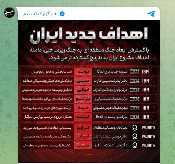 上周二,伊朗塔斯尼姆通讯社在社交媒体上发布了一份美国主要科技公司名单,其中包括亚马逊、微软、Palantir和甲骨文,并配文,“敌人的技术基础设施:伊朗在该地区的新目标”。