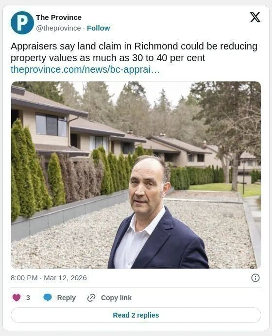 部分BC省(B.C.)的房地产评估师警告称,由于科维昌(Cowichan)土地所有权案件引发的公众负面看法,以及对其潜在影响的不确定性,列治文部分地区的私有土地价值可能下降 30% 至 40%。