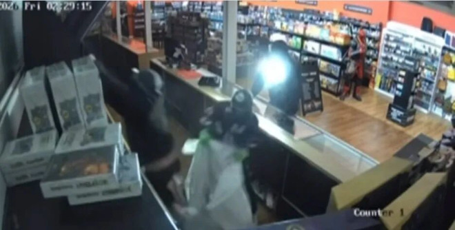 在商店监控录像中拍摄到的黎明前的场景中,蒙面劫匪砸碎了一扇窗户,然后用链条和大钩子钩住安全栅栏,用汽车将其撬开。