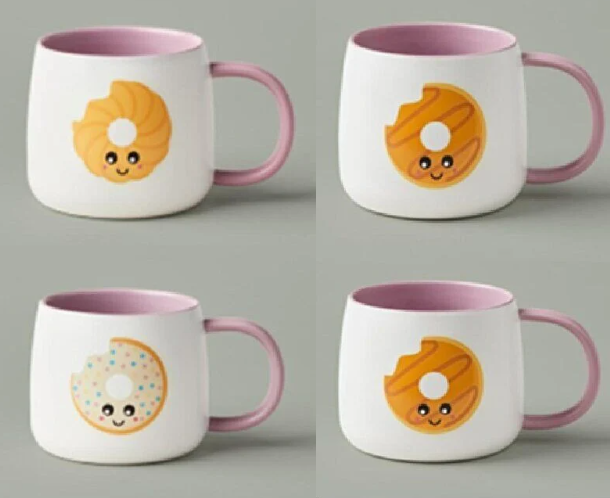 此次召回涉及16盎司陶瓷咖啡杯,杯身正反面印有 拟人化卡通甜甜圈图案。这些杯子产自中国,外观为白色杯身,粉色杯柄和杯内壁。