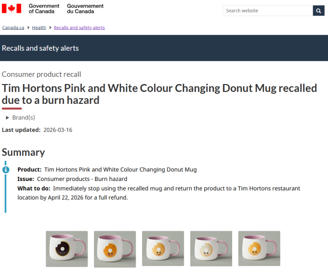 加拿大卫生部(Health Canada)周一发布召回通知称,因部分咖啡杯在装入热饮时可能出现开裂或破碎的情况,Tim Hortons正召回超过2.5万个咖啡杯,并提醒消费者立即停止使用,以避免潜在的烫伤风险。