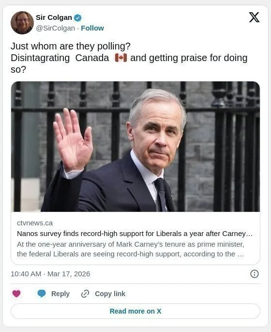 纳诺斯研究首席数据科学家尼克·纳诺斯在每周数据报告中写道:“上一次在纳诺斯跟踪中达到47%支持率的党派是波利耶夫领导的保守党(截至2025年1月10日)。而卡尼领导下的自由党现在在纳诺斯跟踪中支持率创历史新高”。