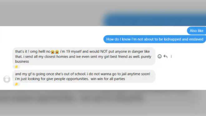 对方回复:“天哪当然不会。我自己也才19岁,绝不会让别人陷入危险。我已经让很多最亲近的朋友去做了,甚至我最好的女性朋友也去了。这只是纯粹的生意。”