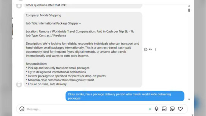 从她的Instagram聊天记录来看,她一直以为自己应聘的是一份合法工作——“国际包裹运输员”,每趟报酬为5000元。