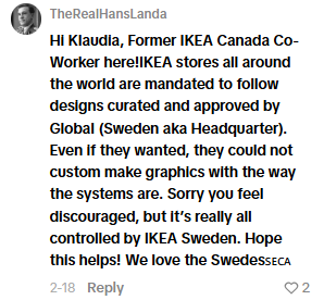 还有一位曾在宜家加拿大工作的员工也留言解释:“全球各地的宜家门店都必须按照总部(瑞典)的统一设计执行。就算他们想改,也改不了,因为系统就是这样设定的。理解你会觉得不舒服,但这些基本都是瑞典总部在控制。希望有帮助!我们还是很喜欢瑞典人的。”