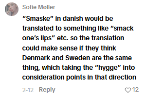 Lennerling在视频里还附上了几张她认为翻译出错的照片。第一张是“Hygge”这个词,她解释说这是一个丹麦词。