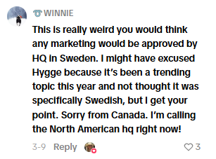 有TikTok网友评论说:“哈哈,这还挺长知识的”,也有人吐槽:“加拿大的宜家也太尴尬了吧。”“作为一个丹麦人,我看到那个牌子的时候忍不住哈哈大笑。我懂你的感受,这让我很开心。 :D”