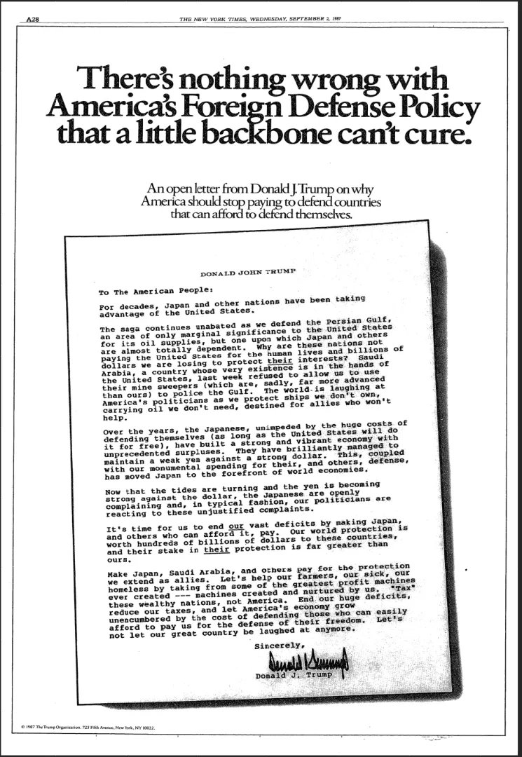 特朗普一直对日本依赖美国军事力量心存不满,这种情绪甚至可以追溯到几十年前。1987年,特朗普在《纽约时报》刊登整版广告,谴责日本依靠美国的军事力量从中东获取石油,呼吁美国的国防政策“有点骨气”。