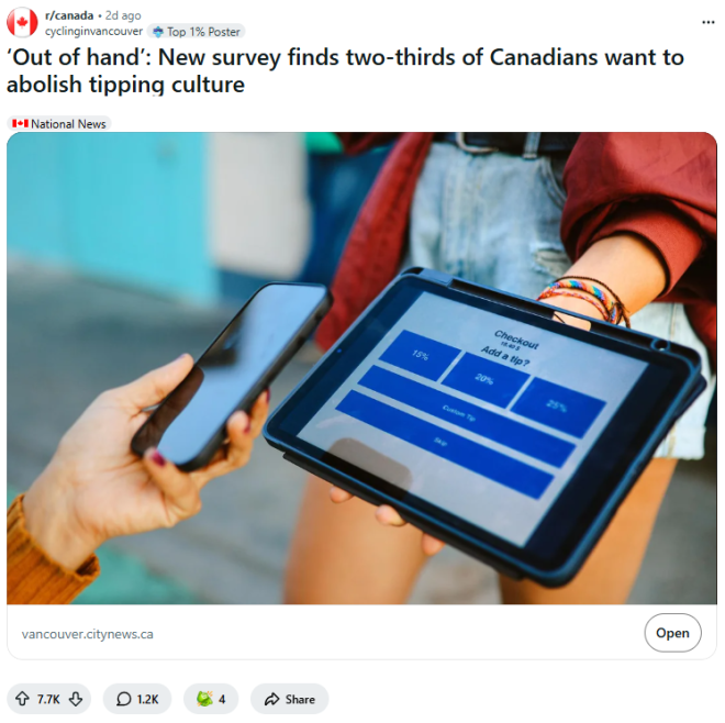 不少加拿大人其实并不怪员工要小费。H&R Block在2025年的调查发现,88%的加拿大人认为,小费文化已经变成了雇主压低员工工资的一种手段。