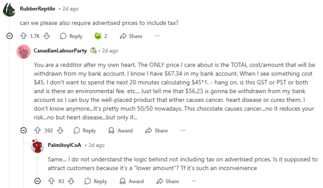 下面一位网友回复说:“你这话真是说到我心坎里了。我唯一关心的就是——最后到底要从我银行卡里扣多少钱。我明明知道自己账户里只有67.34刀,看到一个商品标价45刀,我可不想接下来花20分钟去算:45×1点几……等等,这里是收GST还是PST,还是两种都有?有没有什么环保附加费之类的……你就直接告诉我,最后会从我账户里扣56.23刀就完了,我好决定要不要买这个‘摆在那正好勾引我’的商品——至于它是会让我得癌症、心脏病,还是能预防这些病,说实话我现在也搞不清了……”