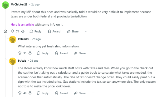 有位网友表示自己曾经给议员提过这个建议,得到的回复是:由于税收同时属于联邦和省级管辖范围,因此很难实施。