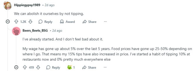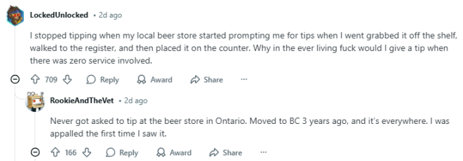 在Reddit上,有网友留言说:“我家附近的啤酒店开始让我给小费之后,我就不再给了——我自己从货架拿商品,走到收银台,再放到柜台上,全程没有任何服务,凭什么还要给小费?”