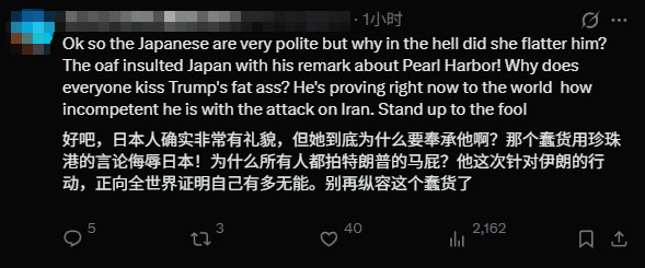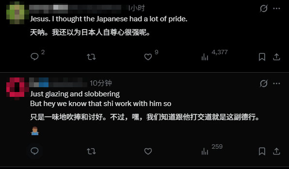 评论区,不少网友对高市早苗这种谄媚的姿态感到疑惑,“还以为日本人自尊心很强呢”。