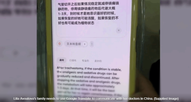 Avoutova在抵达昆明后不久突发严重中风,并自那以后一直处于昏迷状态。