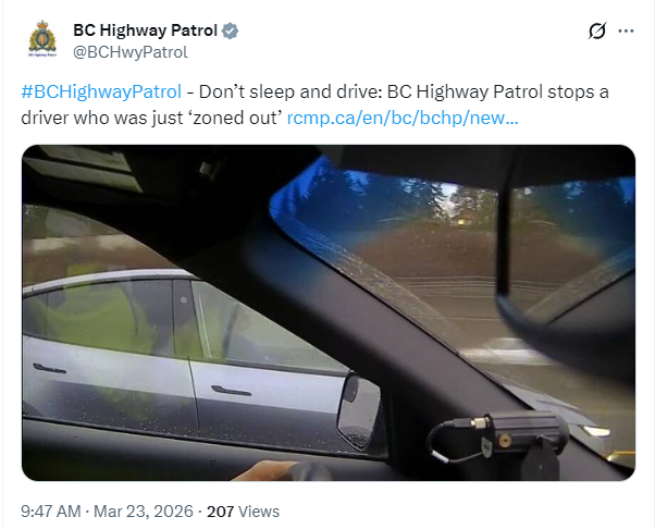 卑诗省高速巡警(B.C. Highway Patrol)警官Michael McLaughlin后来形容,这名司机“看起来几乎就是在方向盘后面睡着了”。