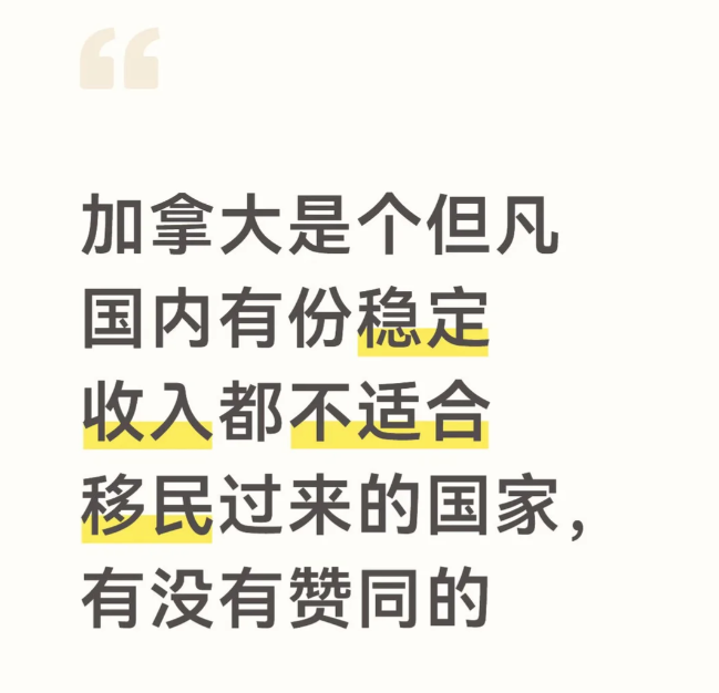 一位小红书网友发帖说:加拿大是个但凡国内有份稳定收入都不适合移民过来的国家,有没有赞同的?