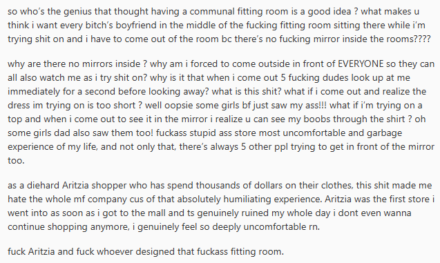 发帖网友在Reddit论坛上崩溃直言:“Aritzia的试衣间,是我经历过最羞辱的体验。”