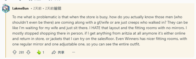 “对我来说,最让人不舒服的一点是:当店里人多的时候,你根本没法判断那些男的到底是真的在等女朋友/老婆,还是只是随便走进来的怪人。他们完全可以说一句‘我在等我老婆’,然后就坐在那里不走了。我真的非常讨厌这种布局,还有那种试衣间里连镜子都没有的设计。我现在基本已经不怎么去Aritzia店里逛了。说实话,就连Winners的试衣间都比它好——至少有一个正常镜子,能把整套穿搭看得清清楚楚。”
