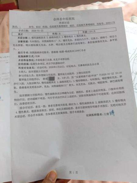 此外,在姚青提供的会泽县中医医院术前讨论记录中,某董姓主治医师给出的意见是双侧扁桃体三度肿大,但诊断依据一栏中肿大度数又写明为二度。姚青不明白为何会出现不一致。