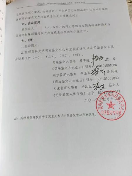 据3月12日昆明医科大学司法鉴定中心出具的司法鉴定,孩子死因是左侧扁桃体切除术后创面突发大出血,致急性失血性休克死亡。3月19日,会泽县中医医院向媒体表示,针对该事件院内已有专门部门处理。会泽县卫生健康局表示已启动调查程序,并将病历封存,需等待鉴定确定责任划分。近日,《中国新闻周刊》致电会泽县中医医院,对方表示不清楚该事件进展。