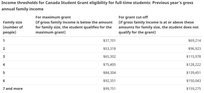 加拿大学生助学金按“家庭收入+人数”计算:收入越低拿越多,超过上限直接没资格,中间区间则按比例递减。