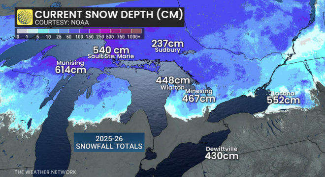 位于Coldwater-Warminster的一个ECCC气象站,截至3月21日累计降雪达到539厘米。而这个数字又被Sault Ste. Marie以微弱优势超越——后者为540厘米,仅多出1厘米。