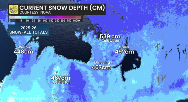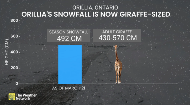 根据加拿大环境与气候变化部(ECCC)的数据,截至3月21日,安省Orillia本季累计降雪已达到492厘米,超过了2024-25年的485.4厘米。同时,这一数字也打破了此前1995-96年创下的490.1厘米历史纪录。