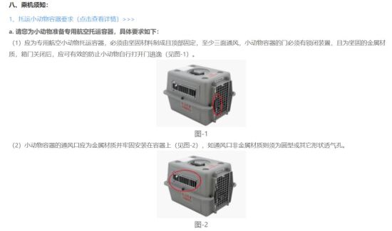 随后,中国新闻周刊查询东航《小动物运输须知》了解到,航司对托运小动物容器及小动物托运限制等有明确规定。例如,托运容器“箱门关闭后,应可有效防止小动物自行打开门逃逸”;小动物容器外必须使用尼龙防护网,网套网格孔径大小应以动物头部钻不出为准。