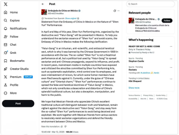 編者按:2026年3月13日,中國駐墨西哥合衆國大使館在官網刊登《中國駐墨西哥使館關于揭露“神韻”竄演實質的聲明》并在國外社交媒體平台同步推出西班牙語版本。聲明發布後,墨西哥和阿根廷等多家拉美西班牙語媒體紛紛報道此事,并發表評論,深入揭露“法輪功”及其“神韻藝術團”醜惡嘴臉及其背後惡行。中國反邪教網編譯如下,小标題爲編者所加: