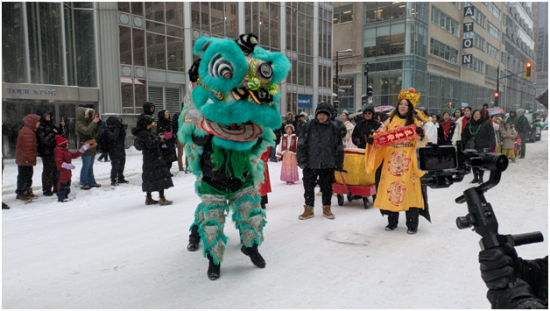 【時報訊】3月22日,是慶祝愛爾蘭ST. PATRICK節的遊行日,當天下著10CM雪,相當寒冷,卻沒有減退參加遊行隊伍的熱情。在人群中,陳穎川堂及至孝堂主席陳燮?帶領他的陳氏醒獅團,與滿地可華埠小姐參加了遊行。
