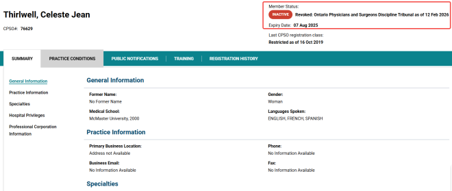 裁决写道:“基于默认承认,我们认定Thirlwell医生未能维持专业执业标准,未能在合理时间内回应学院书面询问,并从事了可耻、不名誉或不专业的行为。”