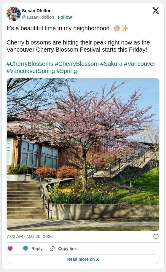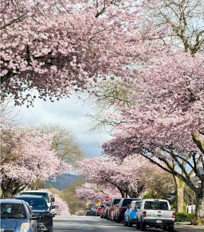 据CBC报道,温哥华樱花节总监安德里亚·阿诺特(Andrea Arnot)建议赏花者前往大卫·林公园欣赏“绝对惊艳”的樱花,或者前往温哥华博物馆附近瓦尼尔公园欣赏“令人惊叹的古老樱花树”。