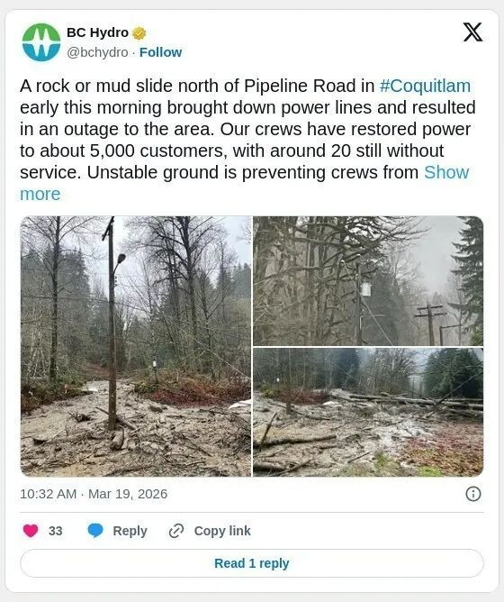 此次泥石流还引发供电中断。BC Hydro表示,当地仍有约15名居民处于停电状态,待确认安全后将展开抢修工作。