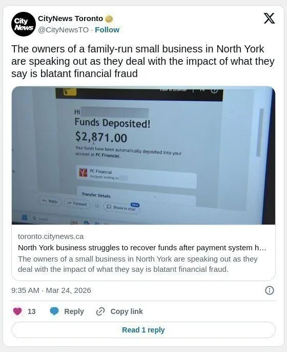 位于多伦多北约克(North York)的一家家族经营小企业近日公开发声,称其遭遇明显的金融诈骗,导致资金损失,目前仍在艰难追讨款项。