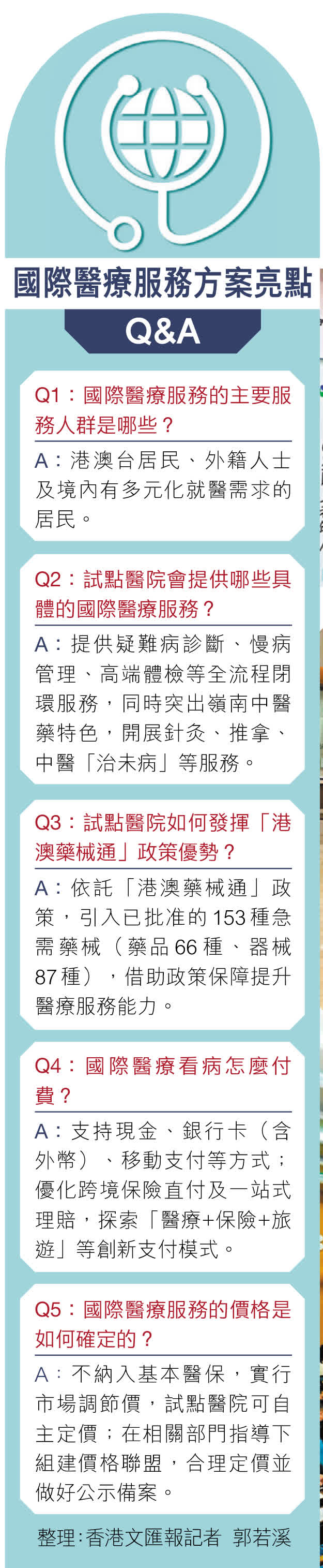 此外,試點醫院還依託粵港澳大灣區優勢,開發「醫療+保險+旅遊」服務產品,推動國際醫療服務打包付費等創新支付模式落地,進一步豐富港澳居民就醫選擇,提升跨境醫療服務的便捷度與舒適度。