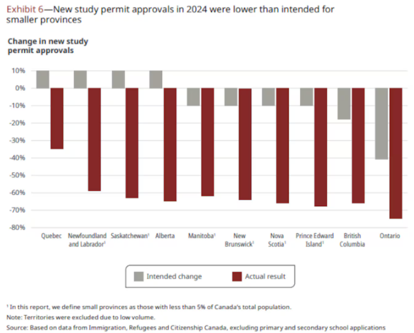 同时,审计长还发现,这一配额政策让国际学生数量下降得比预期更严重。2024年,移民部门批准的新学习许可数量不到预期的一半。报告还指出,小省份受到的冲击更大。Hogan表示:“让人意外的是,移民部门甚至说不清楚为什么会出现这么大的下降。”