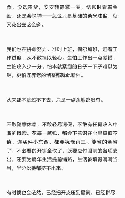 一位网友评论说:确实是这样,我们四口之家,总觉得手停口停,房贷,车贷,保险,地税,日杂费,到月底基本没剩几个钱,我不是病到没法上班都会去上班,需要存好钱以后老了能有点依靠。