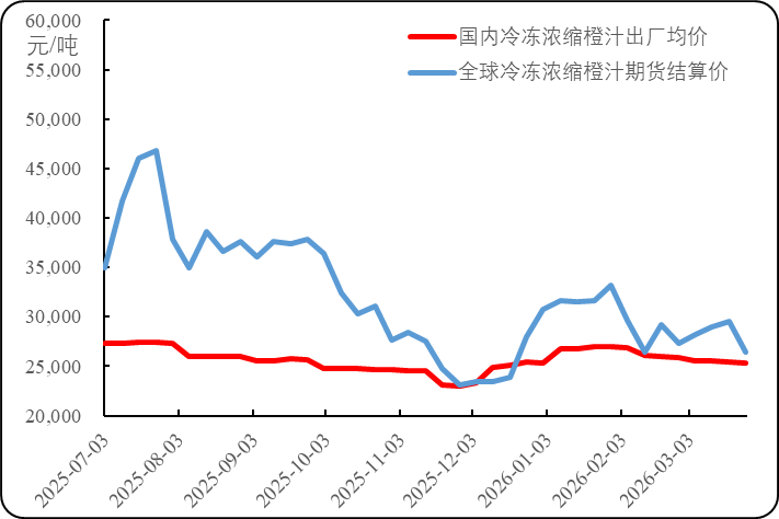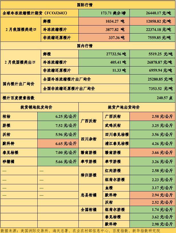 新华财经北京3月26日电(张保贺)巴西橙汁增产与美国橙汁消费增量预期相当,呈现出美洲市场非浓缩还原橙汁产销占比继续提升;埃及甜橙增产且橙汁加工比重上升;我国橙汁产能略有提升且橙汁储备需求量升高。伴随北半球中晚熟柑橘鲜果集中上市且产销两地批发价大多持续下跌,美洲橙汁库存上增量使得近期全球橙汁期货结算价震荡下滑、国内橙汁现货出厂价亦是走弱。其中,出货承压的三峡库区脐橙产地价持续稳弱运行。截至3月26日,当周全球冷冻浓缩橙汁期货合约(FCOJ2605)结算均价为173.71美分/磅(折合26440.17元人民币/吨),环比(3月19日,下同)下跌10.43%;新华·全国冷冻浓缩橙汁出厂价格指数报1025.15点,环比下跌0.53%;新华·全国非浓缩还原橙汁出厂价格指数报1139.47点,环比下跌0.64%;新华·全国橙汁出厂价格指数为1069.00点,环比下跌0.57%。