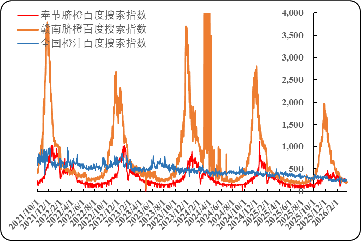 橙汁互联网搜索指数窄幅震荡下滑,侧面反映出国内橙汁库存持续增量与出货不及预期的矛盾显现。同期,气温震荡回升且境内外竞品冲击加剧,导致奉节脐橙互联网搜索指数转跌。具体来看,当周奉节脐橙百度搜索指数均值为228.14点,环比下跌3.91%,同比(2025年3月26日,下同)跌幅缩窄至5.89%;赣南脐橙百度搜索指数均值为207.14点,环比下跌6.99%,同比下跌38.87%;全国橙汁百度搜索指数均值为240.57点,环比下跌0.88%,同比下跌38.38%。同期,冷冻浓缩橙汁现货期货价格均是下跌,期现差缩窄至1159.33元/吨,环比下跌72.10%。