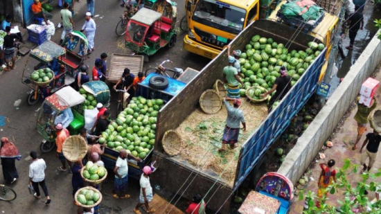 頂圖圖說:3月30日,商販在孟加拉國首都達卡一處市場出售西瓜。(新華社)