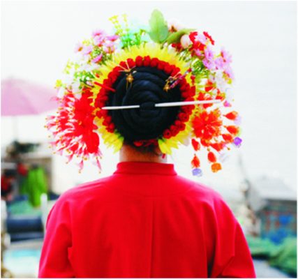 簪花圍是一種髮飾。蟳埔女將長髮在腦後盤成圓髻,用魚骨或象牙制成的一根骨髻橫插固定,圍著髮髻戴上1至5個鮮花花環,在髻心周圍插上金銀髮釵或梳子而成。所用鮮花常見的有茉莉花、玉蘭花、菊花、夜來香等,還有由阿拉伯人從西域移植來的素馨花、含笑花等。簪花圍保留了中國古代婦女裝飾的遺風,也蘊藏著中西方文明交融的歷史印記。這種頭飾經社交媒體傳播後,其視覺元素被年輕設計師以3D打印等技術手段重新演繹,成為時尚配飾設計的新素材。