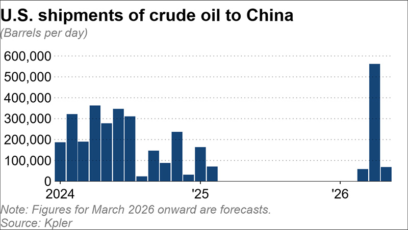 美国对华原油出口量(桶/日),2026年3月及之后的数值均为预测值。 《日经亚洲》援引Kpler制图