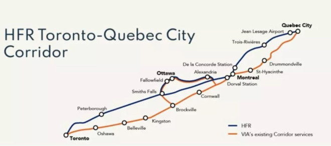 据悉,该项目由国有公司Alto负责推进,预计总投资高达600亿至900亿元,规模之大在加拿大基础设施史上罕见。规划中的线路全长约1000公里,设有多伦多、彼得伯勒、渥太华、拉瓦尔、蒙特利尔、三河市及魁北克市七个站点。项目建成后,列车最高时速可达300公里,从多伦多至蒙特利尔通行时间将缩短至约3小时。