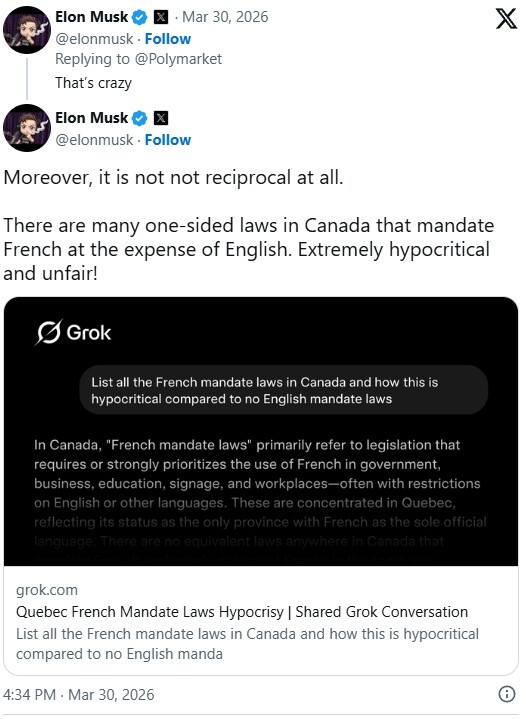 “这太疯狂了,”马斯克在X上回复一则相关帖子时写道,“而且这完全不对等。有很多单方面的,强制推行法语而牺牲英语。这极其虚伪且不公平!”