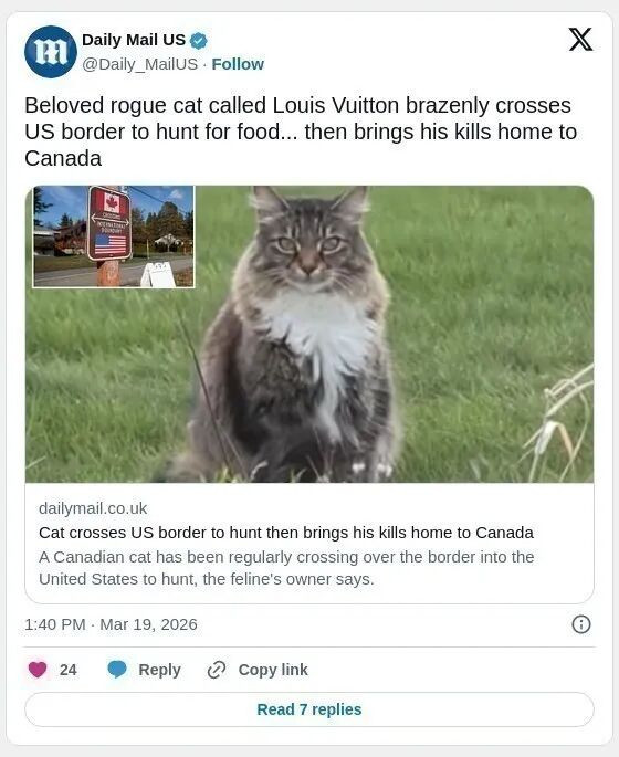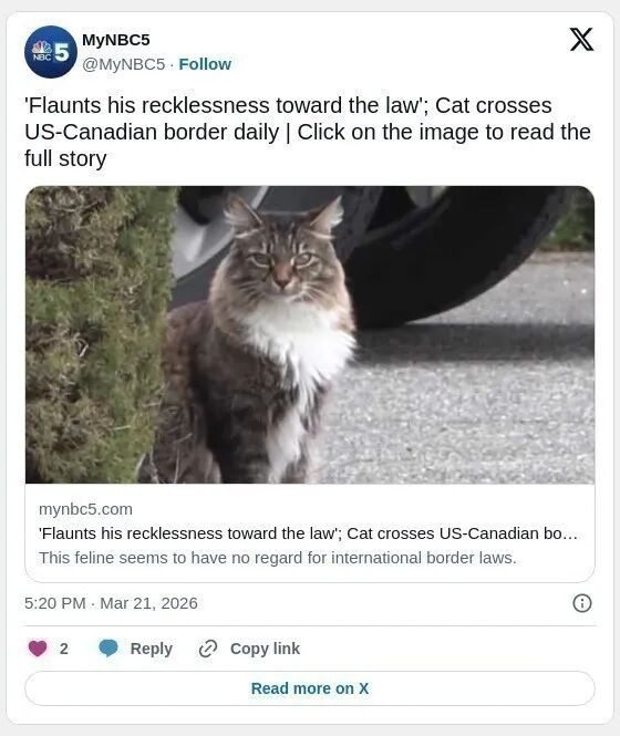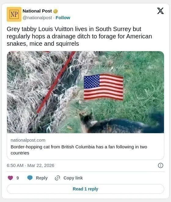 这只猫生活在南素里(South Surrey)Zero Avenue一带,经常从加拿大跳跃穿越边境,进入美国华盛顿州。它几乎每天都会进行这样的“跨国探险”,大胆行为吸引了全球网友的关注,迅速成为网红猫。