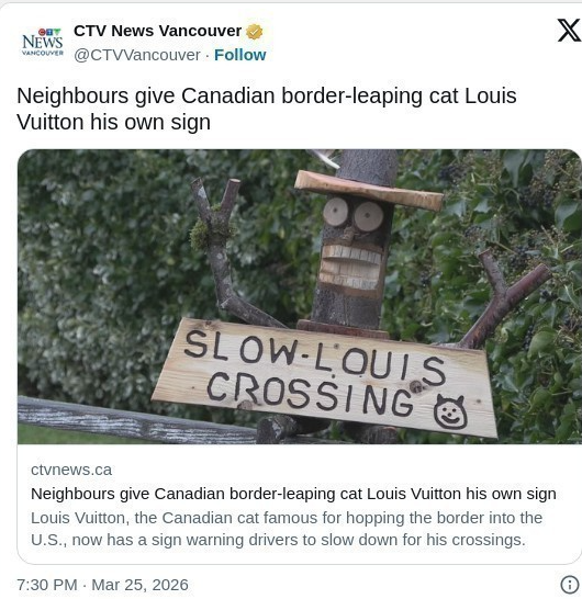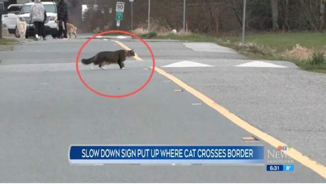 (网综合) 在大温边境小镇,一只名叫“路易 威登”(Louis Vuitton)的猫因频繁“越境旅行”而走红网络。现在,当地居民专门为它设立了道路警示牌,提醒过往车辆减速,确保这位“边境常客”的安全。