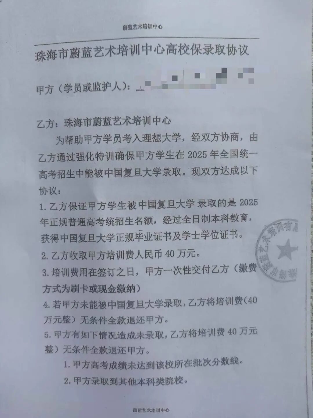 一位家长出示的《珠海市蔚蓝艺术培训中心高校保录取协议》显示,为帮助甲方学员考入理想大学,经双方协商,由乙方(机构)通过强化特训确保甲方学生在2025年全国统一高考招生中能被中国复旦大学录取。培训费为40万元,如果未被录取,乙方承诺无条件退款。
