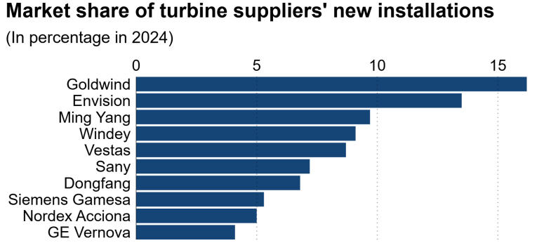 中国企业在全球风力涡轮机市场占据主导地位 《日经亚洲》制图