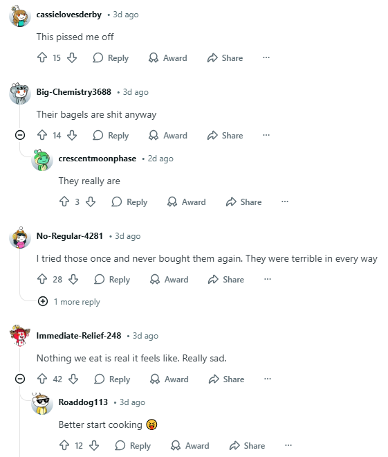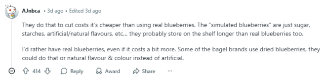 一位网友表示更喜欢真蓝莓,哪怕更贵:“他们这么做主要是为了降低成本,用模拟蓝莓比用真蓝莓便宜得多。“模拟蓝莓”其实就是糖、淀粉、人工或天然香精之类的东西……而且保质期可能也比真蓝莓更长。我个人还是更喜欢用真蓝莓的,就算贵一点也可以。有些贝果品牌会用干蓝莓,其实也可以这样做,或者用天然的香料和色素,而不是人工添加的。”