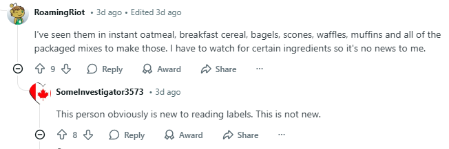 还有一位网友表示这并不是什么新鲜事:“我在速溶燕麦片、早餐麦片、贝果、司康饼、华夫饼、松饼以及所有制作这些的预拌粉里都见过它们。我平常需要留意食品的某些成分,所以这对我来说并不新鲜。”
